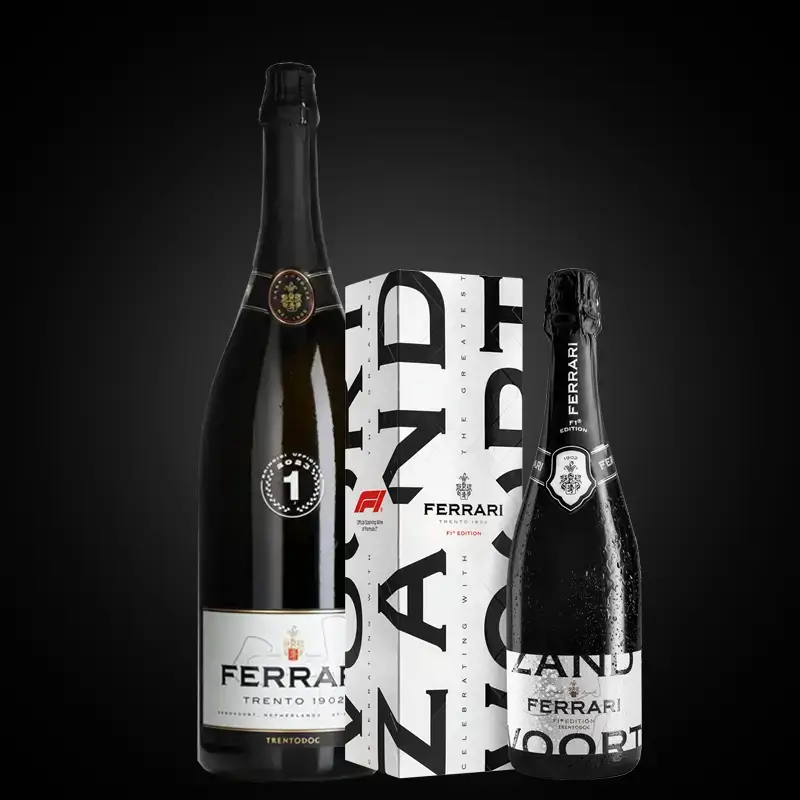 Past de 3-liter Jeroboam niet in je koelkast? Dan hebben we ook een special edition Formula 1 Ferrari Brut van 75 cl. in een mooie geschenkverpakking!